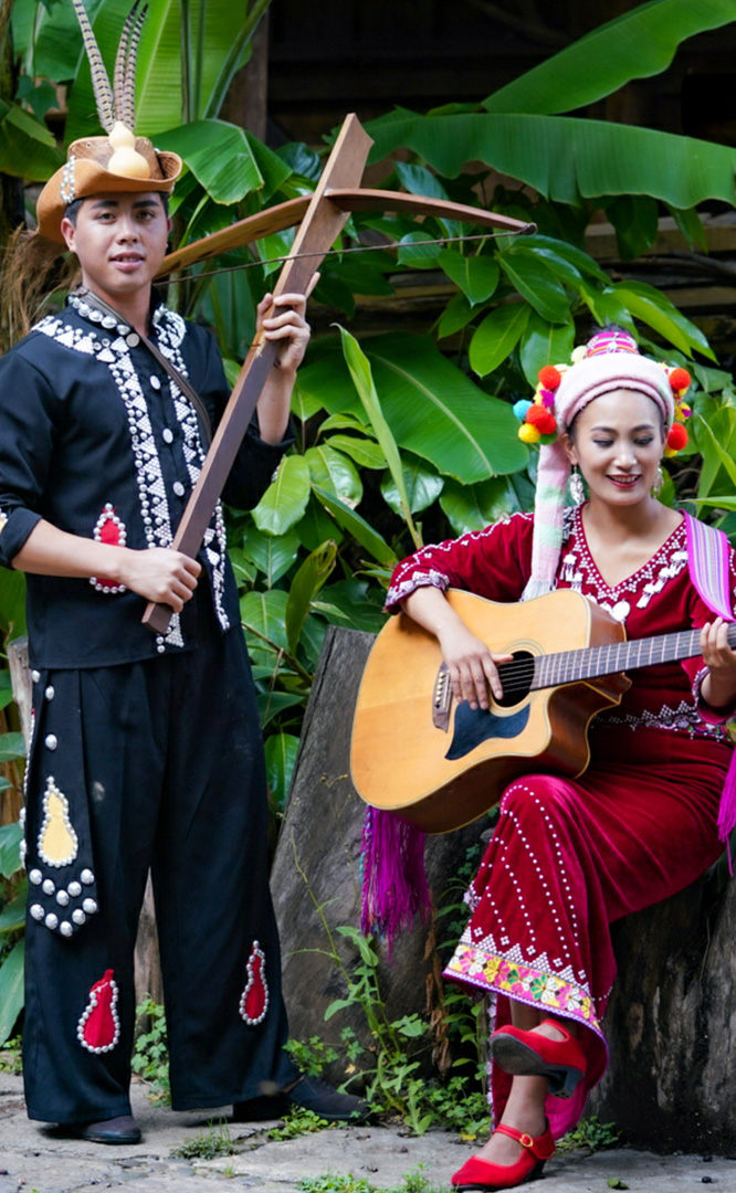 德昂族人口約1.7萬(wàn),主要分布在德宏州和保山市的潞西、梁河、瑞麗、隴川、隆陽(yáng)等縣區(qū)。民居多為草排覆頂竹木結(jié)構(gòu)的干欄式建筑,眼前的德昂村建筑納入了能容納數(shù)十人居住的德昂大房子,氈帽頂?shù)男》孔樱€有頗具浪漫色彩的大公房、小公房……還建有“龍陽(yáng)塔”標(biāo)志及佛教奘房、佛塔。德昂族民間普遍信奉南傳佛教,民俗活動(dòng)與佛事活動(dòng)關(guān)聯(lián)緊密。潑水節(jié)、開(kāi)門(mén)節(jié)、關(guān)門(mén)節(jié)是重大節(jié)日。德昂族服飾色彩豐富,口頭文學(xué)特別是民歌創(chuàng)作活動(dòng)...